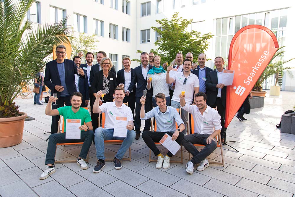 Gemeinsames Foto der Bestplatzierten mit (v.l.) Stefan Finkeldei, Bereichsleiter Firmenkunden der Sparkasse Dortmund, Lilli Schönleben, Louis Mulorz, Obermeister der Tischler-Innung Dortmund und Lünen Dirk Goebel, Sieger Maximilian Vogdt und Lehrlingswart Ulrich John.