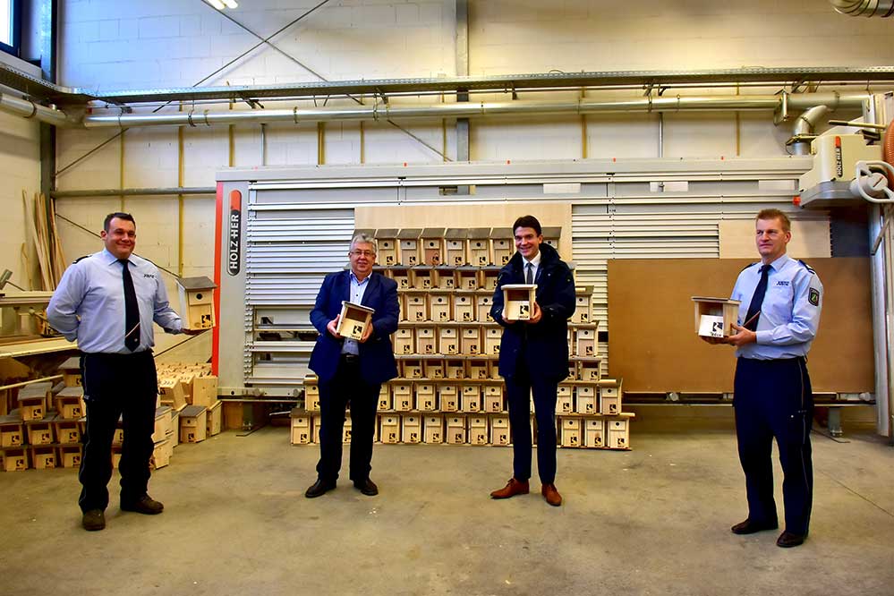 Bildzeile: Prof. Dr. Uli Paetzel (2.v.r.), Vorstandsvorsitzender von Emschergenossenschaft und Lippeverband, nahm in der JVA Castrop-Rauxel die Nistkästen von Wilko Köster (1.v.l.), Julius Wandelt (2.v.l.) und Martin Böllhoff (1.v.r.) entgegen.