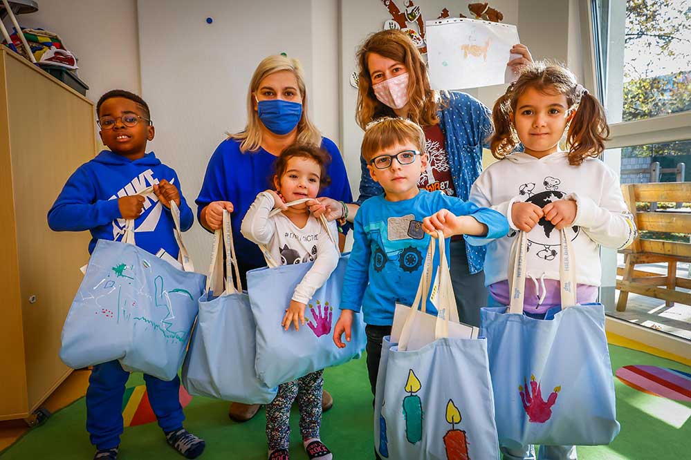 „Das machen wir für arme Leute“, erklärt Jadon. Zusammen mit Emily – sie ist wie Jadon fünf Jahre alt -, ihrer Schwester Marie (4) und Julius (4) bildete er die Kindergarten-Abordnung, die mit Hilfe ihrer Erzieherinnen Sandra Simic und Katharina Duda die Taschen am Martinstag zum Haus der Evangelischen Kirche an der Jägerstraße brachte. Dort übergaben sie die 50 Stoffbeutel an die Wohnungslosenhilfe der Diakonie.