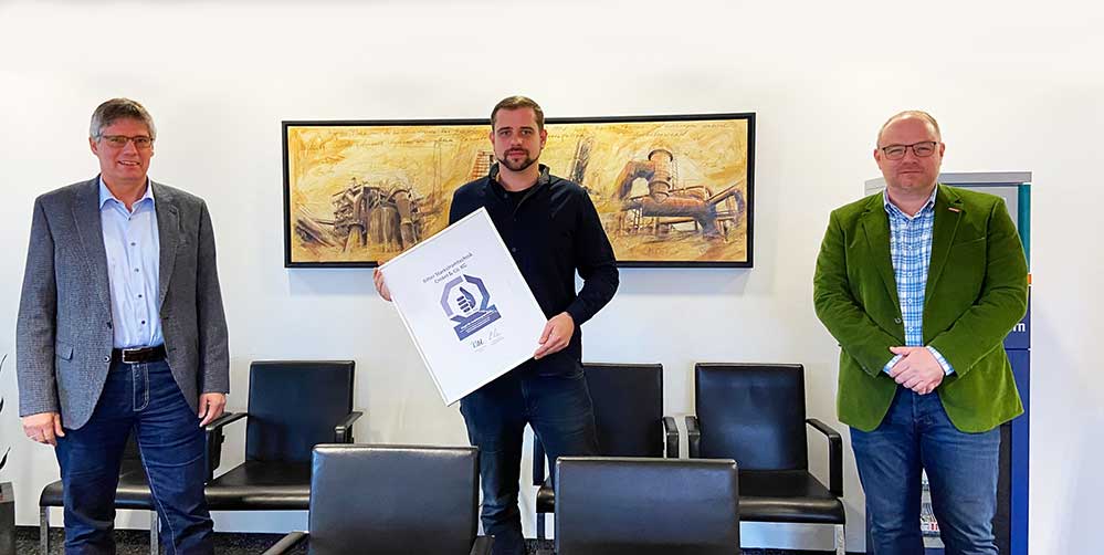 Kein Fest mit jubelnden Kindern, dafür aber gleich dreimal jubelnde Erzieherinnen gab es in diesem Jahr beim Wettbewerb „Unser Bild vom Handwerk“ der Kreishandwerkerschaft Dortmund und Lünen. Statt wie üblich die Sieger-Kinder zum Besuch der Werkstätten des Handwerks in Dortmund-Körne einzuladen, kamen die Vertreter der Kreishandwerkerschaft und der Sponsoren diesmal unter Corona-Bedingungen direkt zu den Kitas. Den ersten Platz sicherte sich diesmal der Kindergarten St. Michael in Dortmund-Lanstrop. Leiterin Nadja Domke und Erzieherin Simone Hein nahmen im Namen der Kinder den Siegerscheck über 500 Euro aus den Händen von Kreishandwerksmeister Christian Sprenger entgegen. Das Geld soll für eine Matschanlage auf dem Außengelände verwendet werden. 13 Kinder im Alter zwischen 5 und 6 Jahren hatten das Siegerbild erstellt und eingereicht.