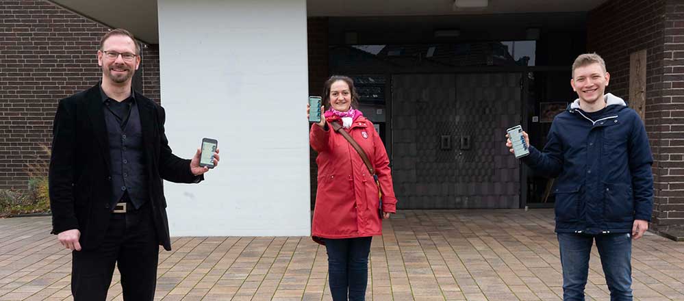 Bildzeile: Redaktionsteam für die App des Pastoralverbundes Am Phoenixsee (v.l.): Sven Laube, Sarah Fitzek und Sebastian Kettler.