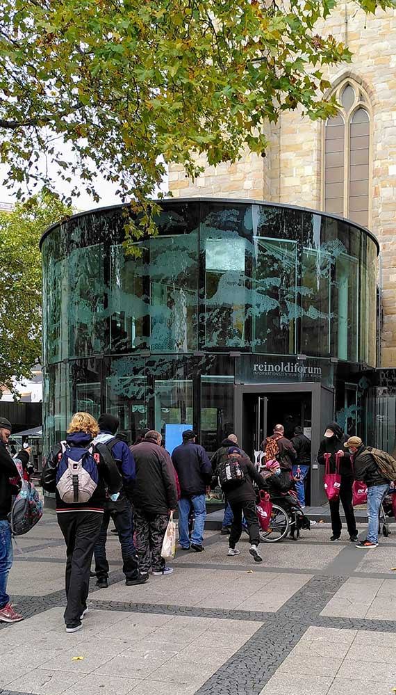 Bildzeile: Lunch-Pakete-Ausgabe an der Reinoldikirche.