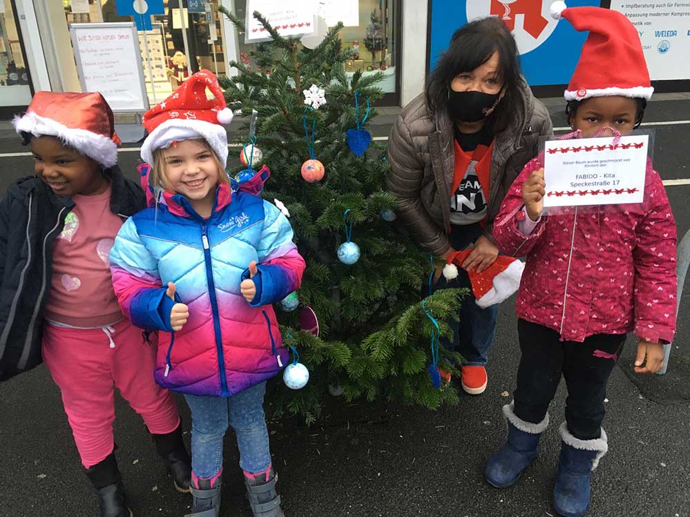 Bildzeile: Das Schmück-Kommando der FABIDO-Kita Speckestraße 17 freut sich über das bunte Ergebnis.