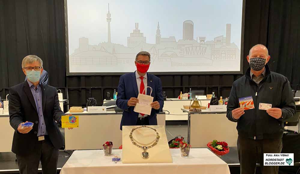 Zum Start der Sitzungsperiode im neuen Rat der Stadt: Kirchliche ‚Wundertüte‘ für neue RatsmitgliederAm Anfang einer Sitzungsperiode nach einer Kommunalwahl laden Evangelische und Katholische Kirche in Dortmund üblicherweise zu einem ökumenischen Gottesdienst ein. Aber in diesem Jahr ist alles anders. Die erste Sitzung des neuen Rats fand unter strengen Hygiene-Auflagen nicht im Rathaus sondern in den Westfalenhallen statt. Und auch der Gottesdienst musste diesmal ausfallen.Daher wandten sich die beiden großen christlichen Kirchen in der Stadt auf andere Weise an die neugewählten Ratsvertreterinnen und -vertreter, um ihnen für ihre Arbeit Glück- und Segenswünsche zu übermitteln. Vor Beginn der ersten Ratssitzung erhielten alle Ratsmitglieder eine kirchliche ‚Wundertüte‘. Darin fanden sie ermunternde Aufmerksamkeiten mit Augenzwinkern wie kleine Segens-Schokoladen oder die 10 Gebote auf ‚Ruhrdeutsch‘.Mit dabei auch ein Anschreiben der leitenden Geistlichen in der Stadt. Superintendentin Heike Proske und Propst Andreas Coersmeier wiesen darin auf die vielfältigen Herausforderungen hin, die in den kommenden Jahren vor den Mitgliedern des Rates lägen. Die reichten von der Bewältigung der Pandemie über sozialen Zusammenhalt, wirtschaftlichen Strukturwandel und Digitalisierung bis hin zum Umgang mit Populismus, Rassismus und Antisemitismus.Mit dem Bibelzitat aus dem Buch Jeremia (Kap. 29): „Suchet der Stadt Bestes und betet für sie“ überschrieben die Geistlichen ihren Brief. „Wir Kirchen mit Caritas und Diakonie wollen auch in Zukunft mit Ihnen gemeinsam ‚der Stadt Bestes‘ suchen und begleiten die Stadt mit unseren Gebeten“, sicherten Heike Proske und Andreas Coersmeier den Ratsmitgliedern zu.Stellvertretend für den Rat nahm der neu gewählte Oberbürgermeister Thomas Westphal vor der ersten Ratssitzung die Wundertüten der Kirchen in Empfang. Überreicht wurden sie vom Evangelischen Pfarrer Friedrich Stiller und seinem katholischen Kollegen Ansgar Schocke. Foto: Alex Völkel
