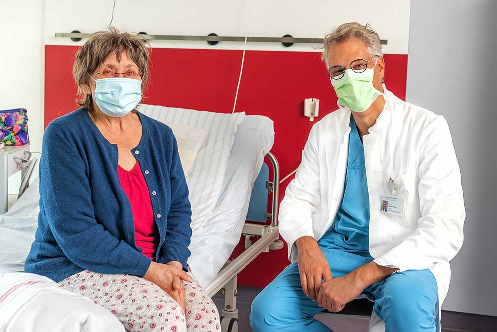 Bildzeile: Renate B. freut sich über die neue Lebensqualität dank Einsatzes der Herzklappe. Mit im Bild ist der Chefarzt der Kardiologie im JoHo Prof. Dr. Helge Möllmann.