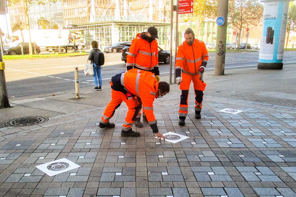 Die Symbole sind die gleichen, die schon von den Hinweisschildern und aus dem Netz bekannt sind. Sie werden mit Schablonen und Sprühfarbe auf das Pflaster aufgetragen. Den Auftrag aus dem Ordnungsamt setzen Tiefbauamt und Stadtteilwerkstatt seit heute gemeinsam um. Begonnen haben die Arbeiten am Vormittag am oberen Westenhellweg.