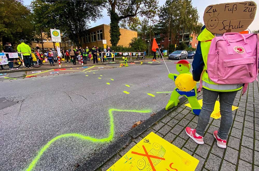 der Liebig-Grundschule auf ihren Aktionstag „Zu Fuß zur Schule“ aufmerksam