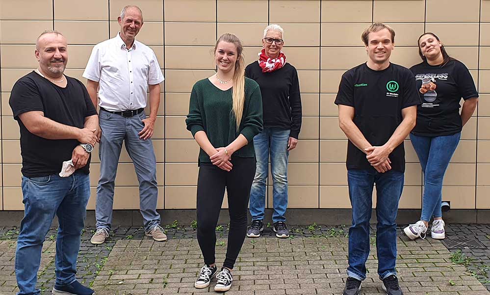 Bildzeile: Einrichtungsleitung Sevgi Basanci (Mitte) und Haustechniker Dominik Augustin (2. v. r.) freuen sich über die Spende des Fördervereins, hier vertreten durch Hans-Jürgen Unterkötter, Monika Anders, Luisa Mota-Vogel und Heidi Nürnberger.