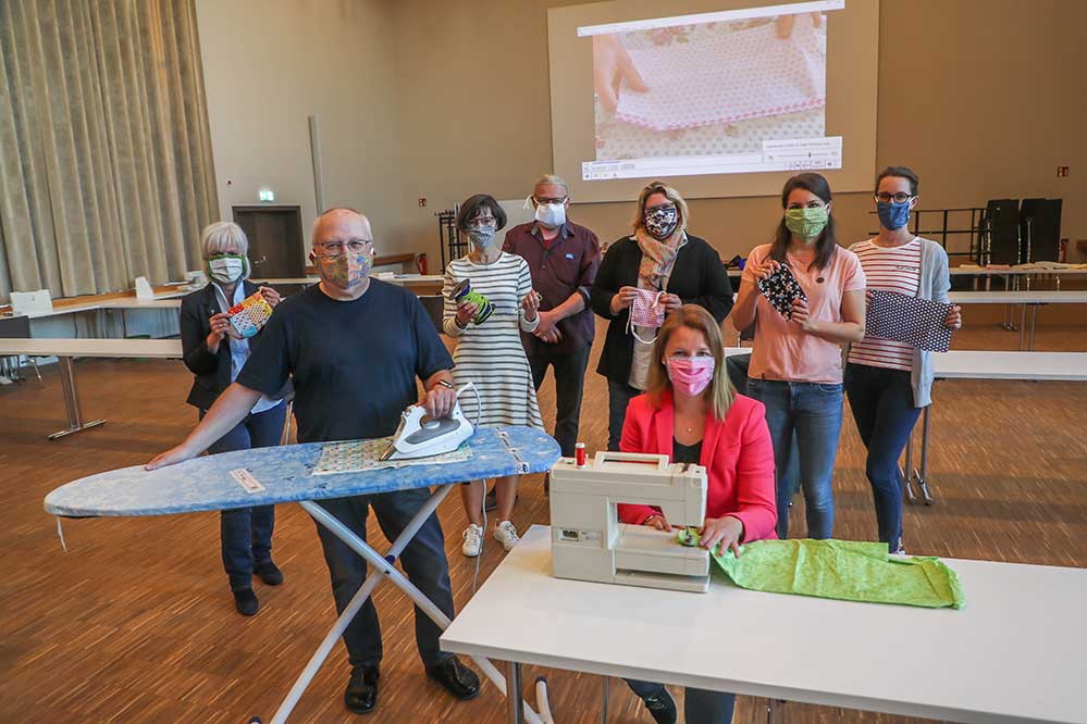 Bildzeile: Sie nähten die ersten Masken: Andrea Auras-Reiffen, stellvertretende Superintendentin des Evangelischen Kirchenkreises (l.), Hans Steinkamp, Vorsitzender der Mitarbeitervertretung (2.v.l.), Lisa Prang, Verwaltungsleiterin (an der Nähmaschine) und Mitarbeitende des Kirchenkreises.