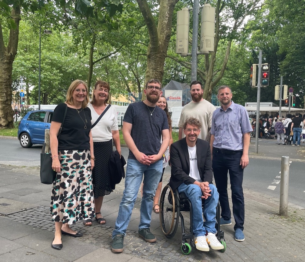 Der Landtagsabgeordnete der Grünen und Sprecher für Inklusion, Dennis Sonne war zu Besuch bei Bethel.regional in Dortmund, um sich über aktuelle Herausforderungen in der Eingliederungshilfe auszutauschen und die Angebote vor Ort kennenzulernen. Mit persönlichem Bezug zur Stadt Dortmund, kam Sonne zunächst in die Geschäftsstelle von Bethel.regional und diskutierte mit der Geschäftsführung, Mark Weigand und Pastorin Verena Schmidt, über wichtige Themen, wie den Arbeitskräftemangel, den inklusiven Arbeitsmarkt, die Umsetzung es Bundesteilhabegestzes und die Wohnungssituation für Menschen mit Behinderungen. Als Verfechter des „inklusiven Wohnens“ setzt sich Dennis Sonne leidenschaftlich für Begegnungen vor Ort ein, und betont, dass so auch rechtsradikalen Tendenzen entgegengewirkt werden könne, um Anschläge wie jüngts auf ein Wohnangebot in Mönchengladbach zu verhindern. Sein Engagement für Inklusion wird durch seine eigene Querschnittslähmung und seine Erfahrungen im Rollstuhl geprägt. Bei seinem Besuch des „Intensiv Ambulanten Wohnangebots“ von Bethel.regional in der Nordstadt erlebte Sonne hautnah, wie Assistenzleistungen für 16 Menschen im Arbeitsfeld der Sozialpsychiatrie organisiert werden und wie Individuelle Unterstützung in den eigenen Wohnungen möglich wird. Die Initiative eines Investors ermöglichte den Umbau eines alten Industriegebäudes, um bedarfsgerechte Wohnungen anzubieten. Jonathan Gehring, Bereichsleiter bei Bethel.regional, betonte die Bedeutung von Sicherheit, Kommunikation und sozialräumlicher Ausrichtung für die Klientinnen und Klienten. Das ließe sich gut in der eigenen Wohnung realisieren. Durch regelmäßige Gruppenaktivitäten und Mieterstammtische werde eine lebendige Gemeinschaft geschaffen, so Gehring. „Menschen nehmen unsere Hilfe vor Ort gut an, da viele direkt aus der Nordstadt kommen.“ Im direkten Umfeld der Wohnungen können die Klientinnen und Klienten das Sozial-Café Berta, einen Gemeinschaftsgarten, Kreativangebote oder die Tagesgestaltenden Angebote von Bethel.regional in den kürzlich eröffneten Räumen direkt am Nordmarkt besuchen. Während seines Rundgangs durch die Nordstadt traf Dennis Sonne auf Petra Vorwig, eine Bodoverkäuferin und Klientin von Bethel.regional, die ebenfalls auf den Rollstuhl angewiesen ist. Die beiden tauschten sich über Themen wie z.B. Barrierefreiheit aus und lobten die vielfältigen Angebote der Nordstadt, wie die „Nachbarbude“, eine Bude für Nachbarschaftshilfe und gegen Einsamkeit. Beeindruckt von der Zusammenarbeit verschiedener Institutionen und engagierter Privatpersonen lobte Sonne die bunte Vielfalt der Nordstadt und versprach: „Ich komme gerne wieder.“