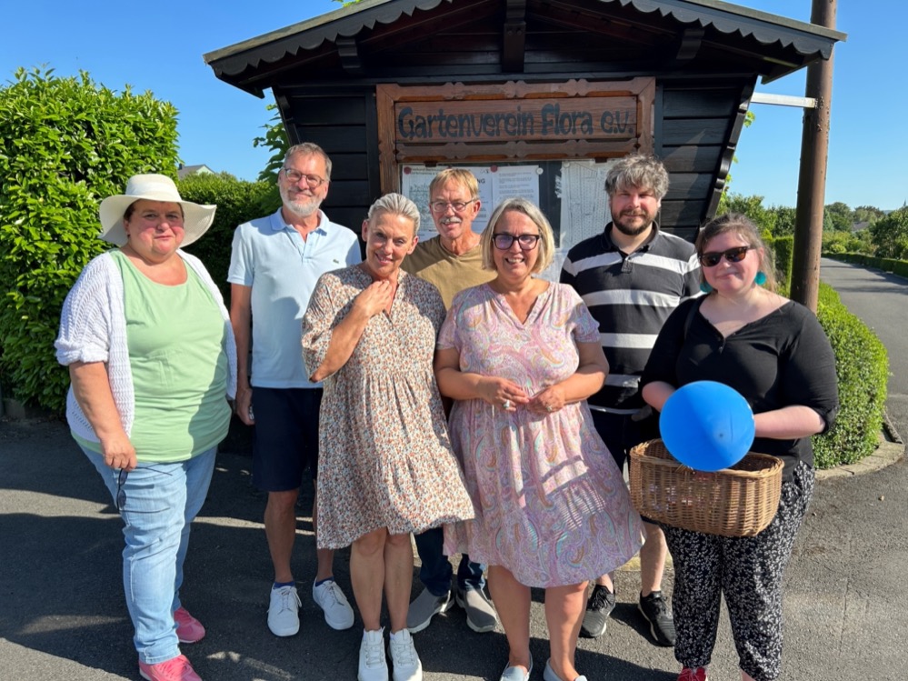 Die Landtagsabgeordnete Anja Butschkau (3.v.r.) besuchte in ihrer Funktion als Ansprechpartnerin der SPD-Landtagsfraktion für das Kleingartenwesen den Gartenverein Flora in Hörde. Begleitet wurde sie von den Bezirksvertreterinnen Ute Seibt (links) und Saskia Kahrmann (rechts) sowie dem SPD-Stadtbezirksvorstandsmitglied Henrik Kahrmann. Gartenvereinsvorsitzende Anke Fuchs (3.v.l.) und Mitglieder ihres Vorstands tauschten sich mit Butschkau über die Herausforderungen im Kleingartenwesen aus, bevor es bei hochsommerlichen Temperaturen auf einen Rundgang durch die Gartenanlage ging.
