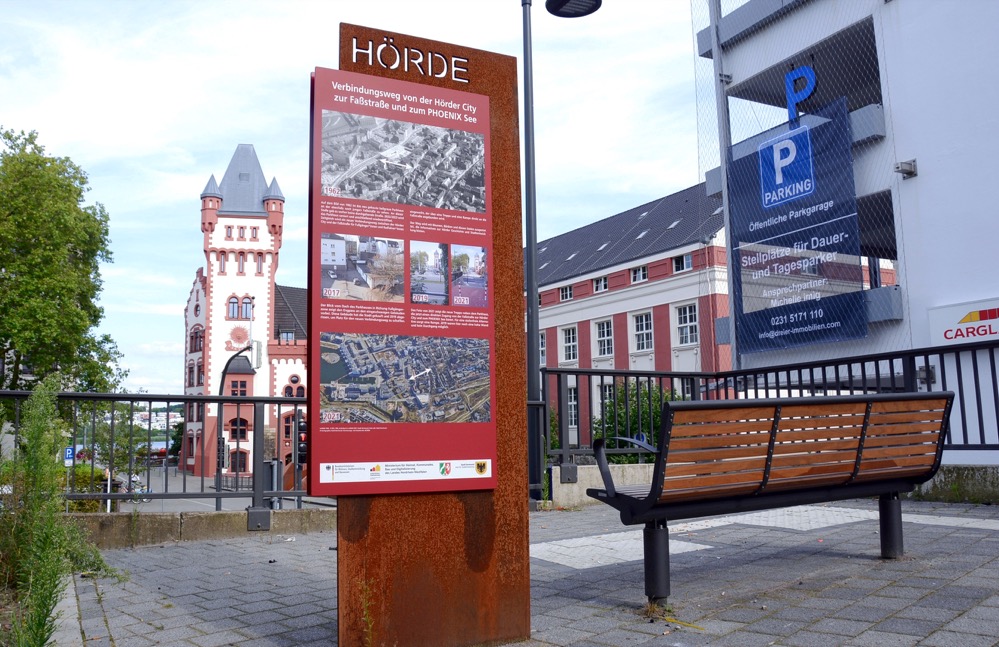 „Ach, so hat es hier mal ausgesehen?“ Solche Sätze könnten bald häufiger im Hörder Ortskern zu hören sein. Sechs Infostelen dokumentieren die Veränderungen seit 2008 im Rahmen des „Stadtumbaus Hörde“ und beleuchten auch größere geschichtliche Zusammenhänge. Historische Abbildungen und aktuelle Luftbilder ermöglichen Vergleiche zwischen der industriell geprägten Vergangenheit des Stadtteils und seiner Gegenwart. Ein Stadtplan auf den Stelen aus charakteristisch-rostigem Cortenstahl hilft zudem bei der Orientierung im Hörder Zentrum. Mit dem Projekt „Stadtumbau Hörde“ hat die Stadtverwaltung seit 2008 viel in Hörde bewegt, damit sich der Ortskern gemeinsam mit den beiden früheren Industrieflächen PHOENIX West und PHOENIX See weiterentwickelt. So wurden etwa die Hörder Bahnhofstraße, die Hochofenstraße, Teile der Gildenstraße und der Hermannstraße und die Faßstraße umgestaltet, ebenso wie der Stadtgarten, die Hörder Brücke und der Friedrich-Ebert-Platz. An der II. Bickestraße wurde der Spielplatz neugestaltet, und bald sorgt die umgebaute Keltenstraße für eine attraktive Wegeverbindung zum PHOENIX See. Die Hörder City erhielt neues Mobiliar, und im Burgunderviertel werden demnächst zusätzliche Straßenbäume gepflanzt. Die Effekte des Stadtumbaus werden auf den Infotafeln in Text und Bild verdeutlicht und in größere historische Zusammenhänge eingebettet. So geht es zum Beispiel um die Geschichte von Bier und Stahl in Hörde oder um die Vergangenheit des Friedrich-Ebert-Platzes als ehemaliger Rathausplatz. Die Konzeption der neuen Stelen hatte das Amt für Stadterneuerung übernommen, die Gestaltung das Vermessungs- und Katasteramt. Das Stadtarchiv steuerte historische Postkarten und geschichtliche Expertise bei. Aufgestellt hat die Stelen das Tiefbauamt. Eine Stele findet sich an der Friedrich-Ebert-Straße, eine weitere an der Hörder Bahnhofstraße in Höhe des Stadtgartens nahe der Bushaltestelle. Drei Stelen stehen im neuen Verbindungsweg zwischen Alfred-Trappen-Straße und Faßstraße (Nagelschmiedegasse). Die sechste Stele wird in Kürze an der Keltenstraße aufgestellt. Die Infostelen sind Teil des Programms „Soziale Stadt – Stadtumbau Hörde“. Der Bund, das Land Nordrhein-Westfalen und die Stadt Dortmund finanzieren dieses Programm gemeinsam. Einige der auf den Stelen gewürdigten Maßnahmen wurden auch von der EU mitfinanziert, die den Stadtumbau Hörde bis 2014 gefördert hat.