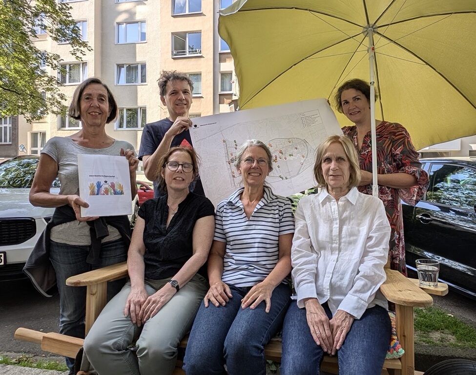 Auf dem Foto von links nach rechts: Birgit Mattern (KA!SERN), Bruno Brödner (Ideenkarte), Sigrun Katscher (BV); Annette Simmgen-Schmude (Gewinner-Projekt „Mobile Schattenbänke im Kaiserviertel“), Christiane Gruyters (Bezirksbürgermeisterin Innenstadt-Ost), Ina Rateniek (Jury-Moderatorin).