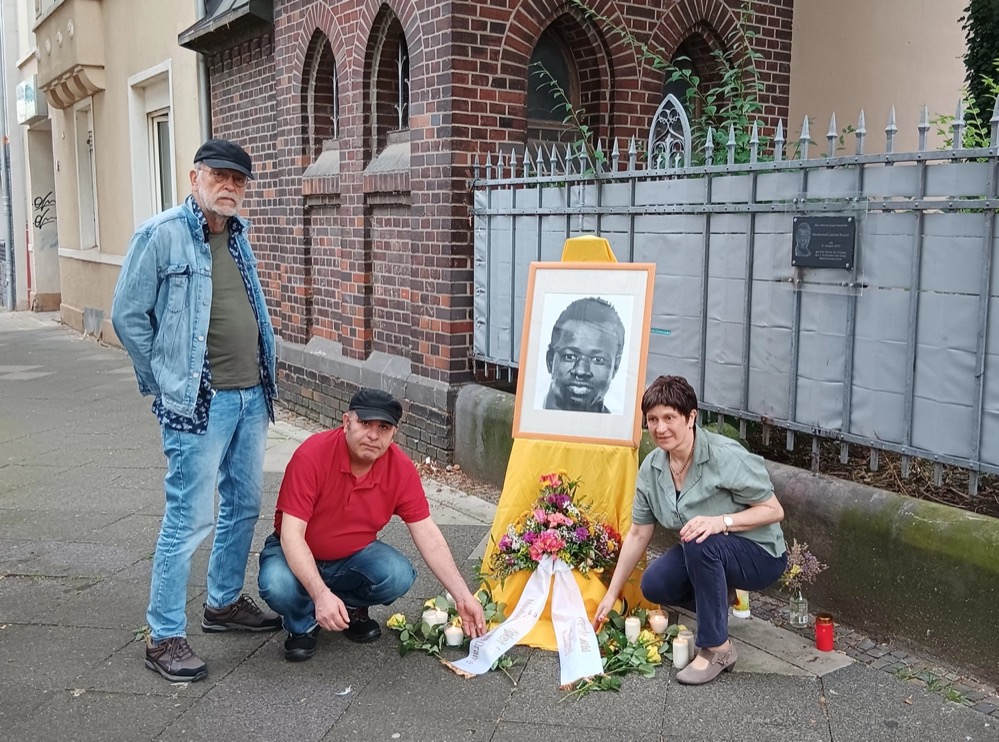 Mitglieder des Freundeskreises Mouhamed Lamine Dramé legten an der Gedenktafel am Ort seiner Ermordung einen Kranz nieder. Vor genau zwei Jahren war der 16 Jährige Flüchtling aus dem Senegal von der Polizei erschossen worden. Statt psychologischer Hilfe für den Selbstmordgefährdeten brachten sie ihm den Tod. Das würdige Gedenken an diesem 2. Jahrestag ist zugleich ein Protest gegen die Prozessführung. Bereits am Vortag fanden Gedenk- und Protestkundgebungen statt, zunächst während des Prozesses vor dem Landgericht und am frühen Abend auf dem Kurt Piehl Platz. „Gerechtigkeit für Mouhamed!“ war von Anfang an die Losung des Freundeskreises. Unter dieser Losung hatte sich eine breiteste Solidarität mit Mouhamed entwickelt. Jetzt soll im noch laufenden Prozess die Polizeigewalt als „Notwehr“ gerechtfertigt werden. Die Kranzniederlegung und die Protestkundgebungen machten deutlich: Gedenken heißt deshalb weiterhin: Solidarität für Mouhamed, gegen Rassismus und wachsende Polizeigewalt, gegen die reaktionäre Flüchtlingspolitik und gegen Faschismus.“