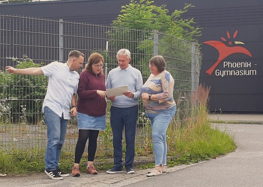 Der Rat der Stadt Dortmund hat die Erweiterung des Phönix Gymnasiums um zwei weitere Gebäudeteile beschlossen. Vor Ort machten sich Ratsmitglied Leif Schmidt, Ortsvereinsvorsitzende SPD Hörde-Süd Monika Driesner-Görke, SPD-BV Fraktionssprecher Werner Sauerländer und BV-Mitglied Cornelia Döring ein Bild. Die Maßnahme ist aufgrund der auch in diesem Stadtbezirk deutlich steigenden Schülerzahlen erforderlich. Die Umsetzung wird sowohl auf dem Schulgelände als auch auf einer benachbarten Fläche an der Fassstraße stattfinden. Letztere war ursprünglich für eine Neugestaltung des Hörder Stadteingangs vorgesehen. Im Ergebnis wird es 2 neue Gebäudeteile geben, einen 3-stöckigen hinter dem existierenden Schulgebäude und einen 4-5 geschossigen an der Fassstraße. Zusammen entstehen so insgesamt rund 4.500m2 Fläche zur Beschulung zusätzlicher Schüler. Um den besonderen Stellenwert des Ortes für Hörde zu unterstreichen, wird ein Architekturwettbewerb für den Entwurf des Gebäudes an der Fassstraße ausgelobt. So soll sichergestellt werden, dass die Aufwertung des Ortes weiterverfolgt wird.