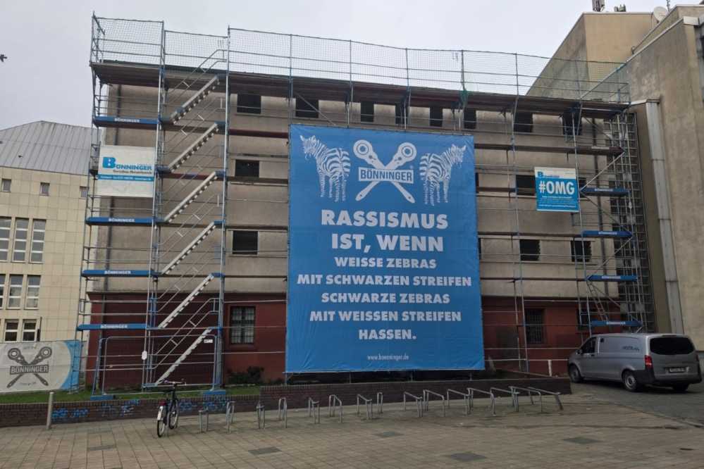 Die Bönninger Gerüstbau GmbH & Co. KG hat nach dem Anti-Rassismus-Banner an der Südseite des Hauptbahnhofs nun auch ein Gerüst an der Nordseite mit einer Botschaft gegen Rassismus gestaltet. Das 80 Quadratmeter große Banner in typischem Bönninger-Blau mit Schwarz-Weiß-Elementen zeigt den Satz „Rassismus ist, wenn weiße Zebras mit schwarzen Streifen schwarze Zebras mit weißen Streifen hassen“ und steht für Vielfalt, Miteinander sowie gegen Ausgrenzung und Diskriminierung. „Mit bildlichen Umschreibungen wie dieser regt man den einen oder anderen vielleicht dazu an, einmal über den Vergleich nachzudenken“, erklärte Christian Bönninger. „Damit schmücken wir unsere Gerüste dann auch gerne.“ Errichtet ist es an der Steinwache auf der Seite zum Vorplatz vor dem Kino. Die Mahn- und Gedenkstätte soll umfangreich saniert werden und umfasst zwei zentrale Teilbereiche: eine neue Dauerausstellung und den Bau eines modernen Empfangsgebäudes.