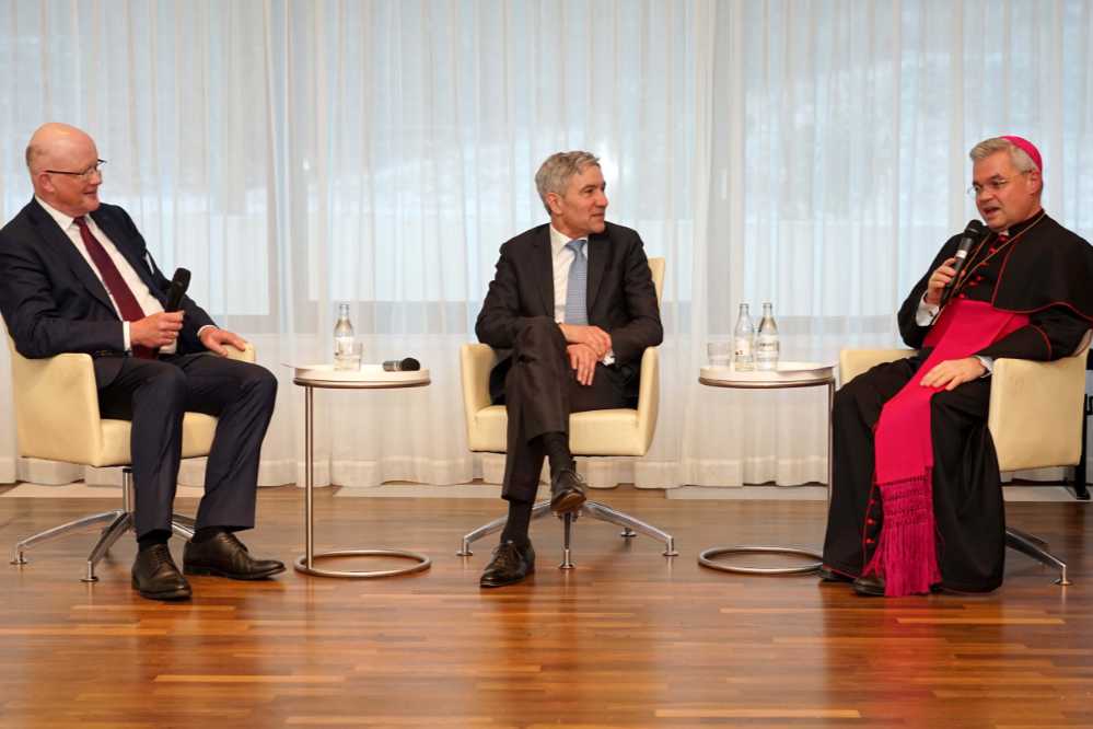 Das Bild zeigt Dr. Hans-Jürgen Schlinkert den Präsident des Bundesverfassungsgerichts, Prof. Dr. Stephan Harbarth, und den Paderborner Erzbischof Dr. Udo Markus Bentz (v.l.) bei einem Podiumsgespräch.
