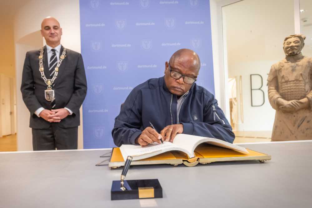 Der Minister für Umwelt und Tourismus der Republik Botswana, Wynter Boipuso Mmolotsi, hat sich im Beisein von Oberbürgermeister Alexander Kalouti in das Goldene Buch der Stadt Dortmund eingetragen. Anlass seines Besuchs ist die Messe „Jagd und Hund“, die noch bis zum 1. Februar in der Messe Dortmund stattfindet und an der Minister Mmolotsi mit einer Delegation aus Botswana teilnimmt. Oberbürgermeister Kalouti begrüßte den Minister im Rathaus und überreichte ihm als Zeichen der Verbundenheit ein Do-Rhino, das geflügelte Nashorn und inoffizielle Wappentier der Stadt. Minister Mmolotsi dankte für die Einladung ins Rathaus und sprach eine Gegeneinladung nach Botswana aus. In das Goldene Buch der Stadt Dortmund tragen sich herausragende Persönlichkeiten aus Politik, Kultur oder Sport ein, die aus unterschiedlichen Anlässen zu Gast in Dortmund sind. Über den Eintrag entscheidet der Oberbürgermeister persönlich, die handschriftliche Vorbereitung erfolgt durch eine Kalligraphin, und während der Eintragung trägt der Oberbürgermeister seine Amtskette. Der erste Eintrag im Goldenen Buch stammt von Kaiser Wilhelm II aus dem Jahr 1899.