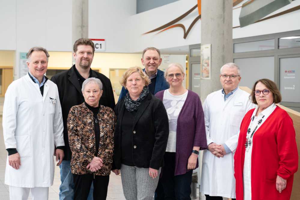 Das Foto zeigt Claudia Middendorf (4.v.l.) mit den Patientenfürsprecherinnen Ulrike Thiel (r.) und Monika Spineux (3.v.l.) sowie Vertretern der Geschäftsführung (hinten v.l. Michael Kötzing, Peter Hutmacher, Prof. Dr. Dr. Stefan Haßfeld), Dr. Andreas Leutner (l.) und Ulrike Mause (3.v.r.).