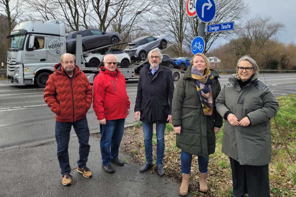 Vertreter:innen der SPD haben sich vor Ort ein Bild von der Verkehrssituation im Wohngebiet „Ewige Teufe“ in Hombruch gemacht, das trotz eines seit über einem Jahr bestehenden Neubaugebiets bislang keine sichere Verkehrs- und insbesondere fußläufige Anbindung aufweist. An dem Ortstermin nahmen die Landtagsabgeordnete Anja Butschkau, die Ratsvertreterin Marthe Pflüger, der Vorsitzende des SPD-Ortsvereins Brünninghausen Horst Tieling sowie Bezirksbürgermeister Volker Schultebraucks teil, unterstützt von Anwohner Theo Wolter. Zentrale Problematik ist die fehlende fußläufige Anbindung, da Anwohner:innen derzeit gezwungen sind, den Radfahrstreifen der stark befahrenen Zillestraße, einer Landesstraße in Zuständigkeit von Straßen.NRW, zu nutzen. Ein sicherer Gehweg fehlt. Der Bebauungsplan sieht einen Fußweg über städtisches Gelände zur Zillestraße mit Anschluss an der Ampelkreuzung Gotthelfstraße sowie eine Anbindung an den Generationenweg vor, die bislang nicht umgesetzt wurden. Zudem wurden die Fahrbahnmarkierungen auf der Zillestraße nicht angepasst, sodass eine Ein- und Ausfahrt nur eingeschränkt möglich ist, obwohl laut Bebauungsplan eine Linksabbiegerspur vorgesehen ist. Die SPD kündigte an, die Umsetzung der Maßnahmen bei der Stadt Dortmund und bei Straßen.NRW einzufordern, um zeitnah sichere und praktikable Lösungen für alle Verkehrsteilnehmenden zu erreichen.