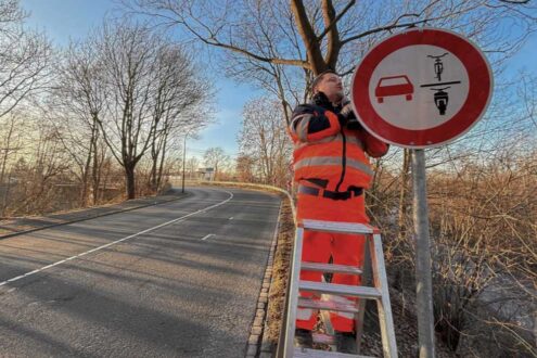 Die Stadt Dortmund hat auf der Brücke der Flughafenstraße über die Gleise am Scharnhorster Bahnhof erstmals dauerhaft das Verkehrszeichen 277-1 eingeführt, das das Überholen von einspurigen Fahrzeugen durch mehrspurige Kraftfahrzeuge verbietet. Anlass waren wiederholte Hinweise von Bürger:innen auf gefährlich geringe Seitenabstände beim Überholen von Zweirädern auf der engen, U-förmigen Brücke. Das Schild wurde bereits installiert und soll die Verkehrssicherheit für alle erhöhen. Bisher kam das Zeichen in Dortmund nur temporär in Baustellenbereichen zum Einsatz. Die Lösung wurde gemeinsam mit der Polizei Dortmund vor Ort erarbeitet, da kurzfristig keine bauliche Veränderung möglich ist. Hintergrund ist, dass der gesetzlich vorgeschriebene Mindestüberholabstand von zwei Metern außerhalb geschlossener Ortschaften nur durch Überfahren der durchgezogenen Mittellinie eingehalten werden könnte, was an dieser Stelle nicht zulässig ist. Verstöße gegen das Überholverbot werden mit mindestens 70 Euro Bußgeld und einem Punkt in Flensburg geahndet, bei Gefährdung oder Unfall können höhere Strafen folgen. Stadt und Polizei nehmen die Maßnahme zum Anlass, für mehr Rücksichtnahme und die Einhaltung von Überholabständen zu sensibilisieren, um die Sicherheit aller Verkehrsteilnehmenden zu verbessern.