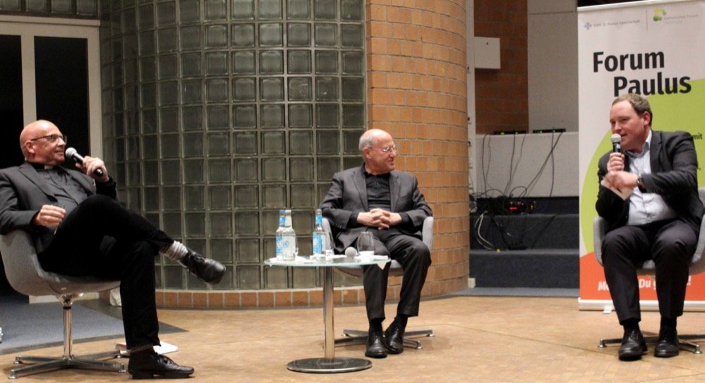 Der überzeugte Atheist schloss seinen Vortrag mit einer persönlichen Anekdote: „Ein gläubiger Mensch hat mir gesagt, dass Gott mich liebt. Darüber habe ich mich sehr gefreut. Wenn es ihn gibt, hoffe ich, dass es auch so bleibt.“ Im Gespräch mit Pastor Stefan Tausch vom Katholischen Forum und Dr. Klaus Klother, von der Kath. St. Paulus Gesellschaft, beantwortete Gregor Gysi auch die Frage, woher er den Optimismus für eine bessere Gesellschaft nehme: „Meine Lebenserfahrung. Ich bin gegen jede Erfahrung Bürger der Bundesrepublik Deutschland. Es gibt eben auch positive Veränderungen. Diese Hoffnung brauche ich.“