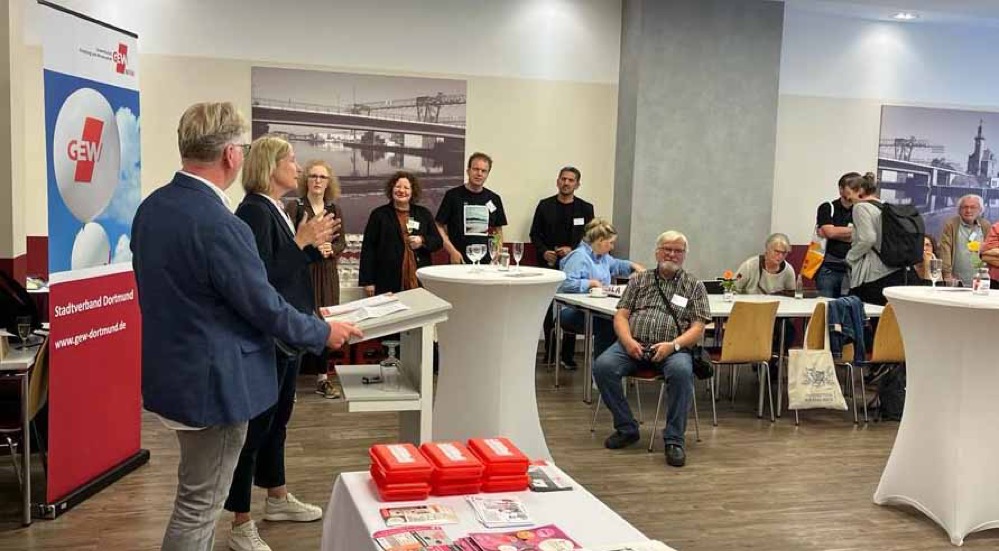 Unter dem Motto „ohne Block und Bleistift“ empfang der Stadtverband der GEW Dortmund Vertreter aus der kommunalen Politik, Schulverwaltung, Verdi und DGB.