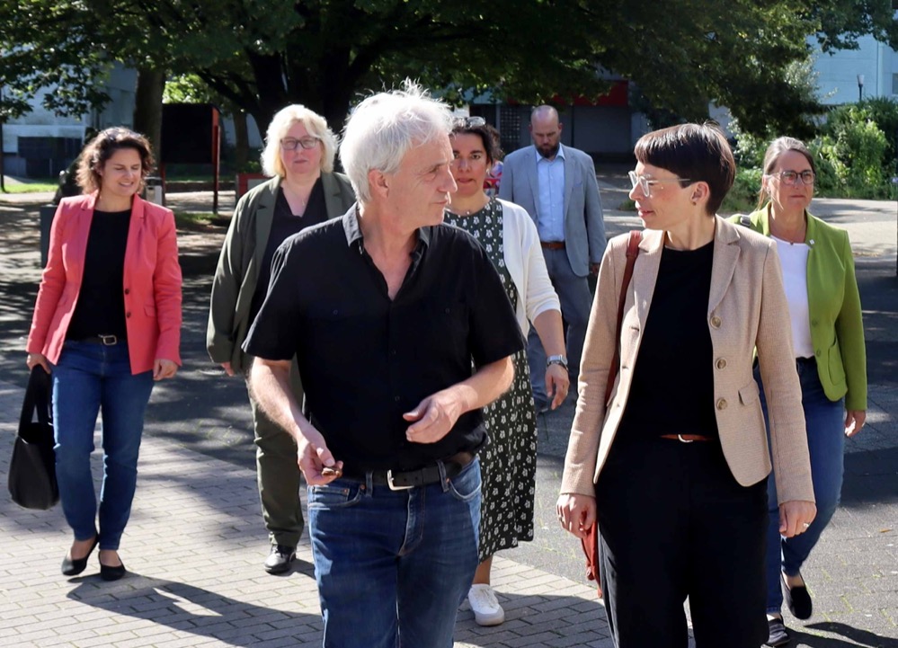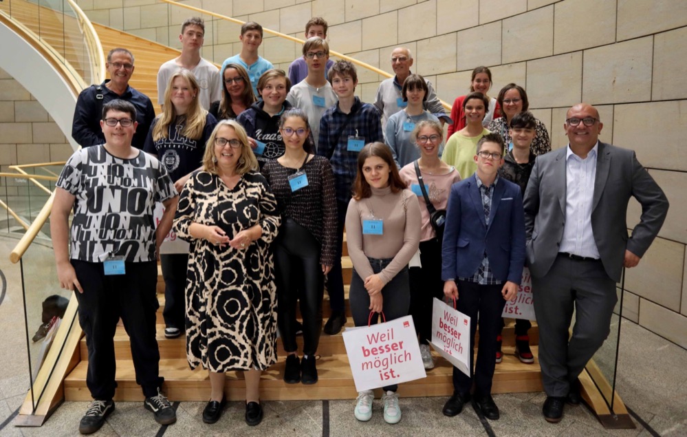 Anja Butschkau hatte die Schüler*innen persönlich ins Landesparlament eingeladen, denn mit ihrem Dortmunder Abgeordnetenkollegen Volkan Baran hatte sie sich in den letzten Monaten dafür eingesetzt, dass mehrere Lehrer*innen der Schule auch zukünftig dort unterrichten dürfen.