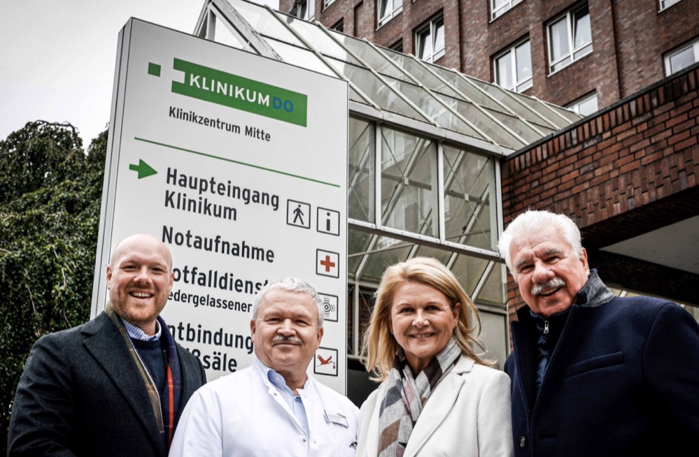 Auf dem Foto sind zu sehen v.l.n.r.: Jens Peick, Prof. Dr. Dr. Stefan Haßfeld (Medizinischer Geschäftsführer Klinikum Dortmund), Sabine Poschmann, Roland Spieß (Vorsitzender Aufsichtsrat Klinikum Dortmund)