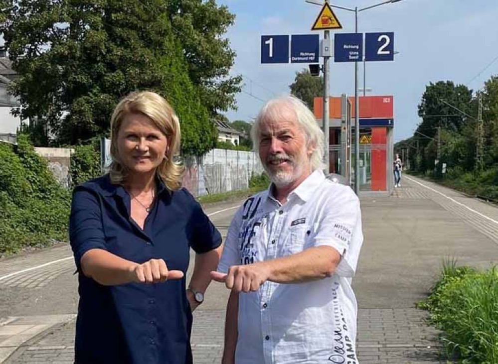 Auf dem Bild ist Sabine Poschmann mit Lothar Buddinger (Vorsitzender des SPD-Stadtbezirks Aplerbeck) am Bahnhof zu sehen.