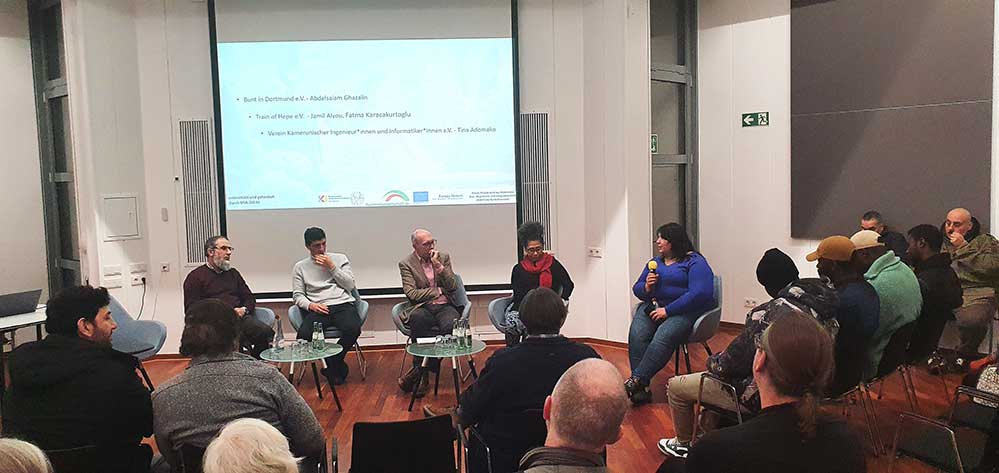 Auch das Engagement der Stadt Dortmund fand zunächst nur lobende Anerkennung. Man werde mittlerweile mit seinen Anliegen auch als nicht-deutscher Verein oder Gruppe gehört, es gebe entsprechende Förderungen – mit der Einschränkung, dass es längst nicht genug seien. „Mehr wäre natürlich besser!“, diesem Plädoyer von Ana-Maria Preduca von Romano Than konnte sich das Podium sofort anschließen. Auch die Fachstellen, zuständig etwa für Kultur oder Integration, würden sehr konstruktiv mit den Organisationen zusammenarbeiten. Dass etwa das Roma-Festival DjelemDjelem und das Tamilische Straßenfest am U, zu denen jeweils tausende Besucher*innen kommen, mittlerweile fest im städtischen Kalender verankert sind, mache stolz. „Wenn wir unsere Traditionen und Feste zeigen und sie mit anderen Menschen feiern können, dann ist das für uns eine wirkliche Befreiung. Das ist Willkommenskultur!“, so Vimalasegaran Shabesan vom Verein tamilischer Künstler.