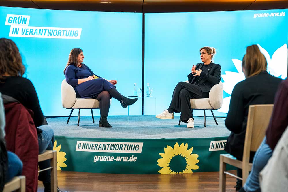 Bildzeile: Die stellvertretende Ministerpräsidentin Mona Neubaur und die grüne Landesvorsitzende Yazgülü Zeybek diskutierten in der Mensa der TU Dortmund über NRW als nachhaltigen Wirtschaftsstandort.