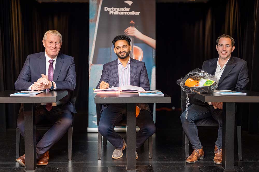 Kulturdezernent Jörg Stüdemann und Tobias Ehinger, Geschäftsführender Direktor Theater Dortmund, gratulierten de Souza und hießen ihn zur Vertragsunterzeichnung herzlich willkommen. In Dortmund hatte er sich in diesem Jahr bereits als Gastdirigent beim 9. Philharmonischen Konzert vorgestellt.