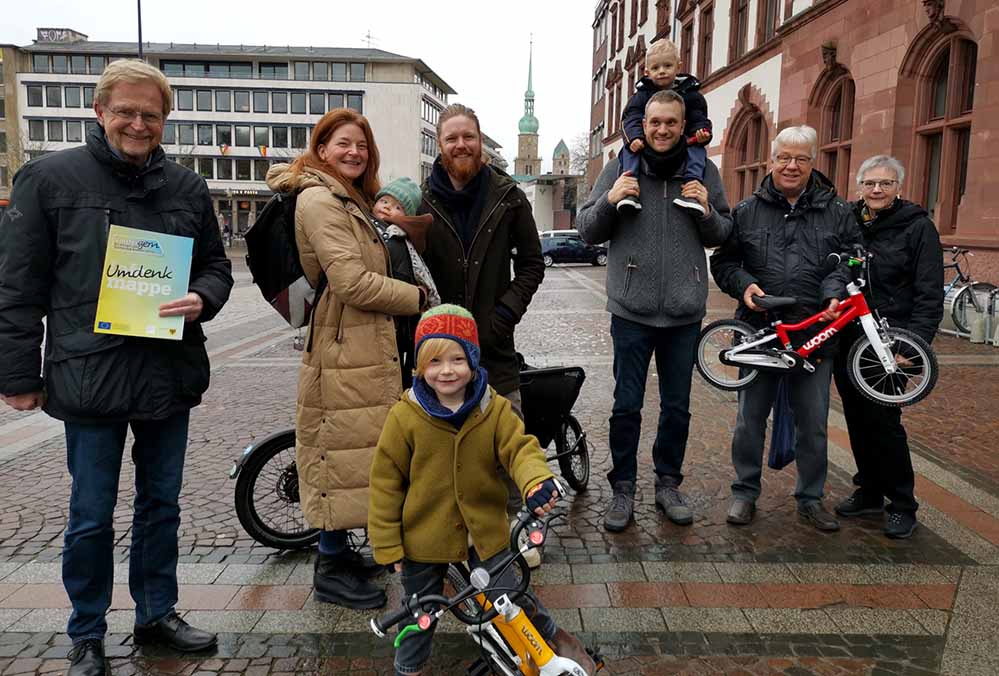 Der 4-jährige Henri macht sofort große Augen als er das größere Rad erblickt, das sein Vater David Herz aus dem Kreuzviertel für ihn gewonnen hat. Für sein altes Rad ist er eigentlich schon zu groß – das neue kommt also gerade recht. Und Henri dreht mit dem neuen Flitzer sofort die ersten Runden auf dem Friedensplatz. Vater David Herz ist gerne mit seinem praktischen Lastenrad unterwegs. Er kennt die App Bike Citzens schon lange und nutzt sie jeden Tag.