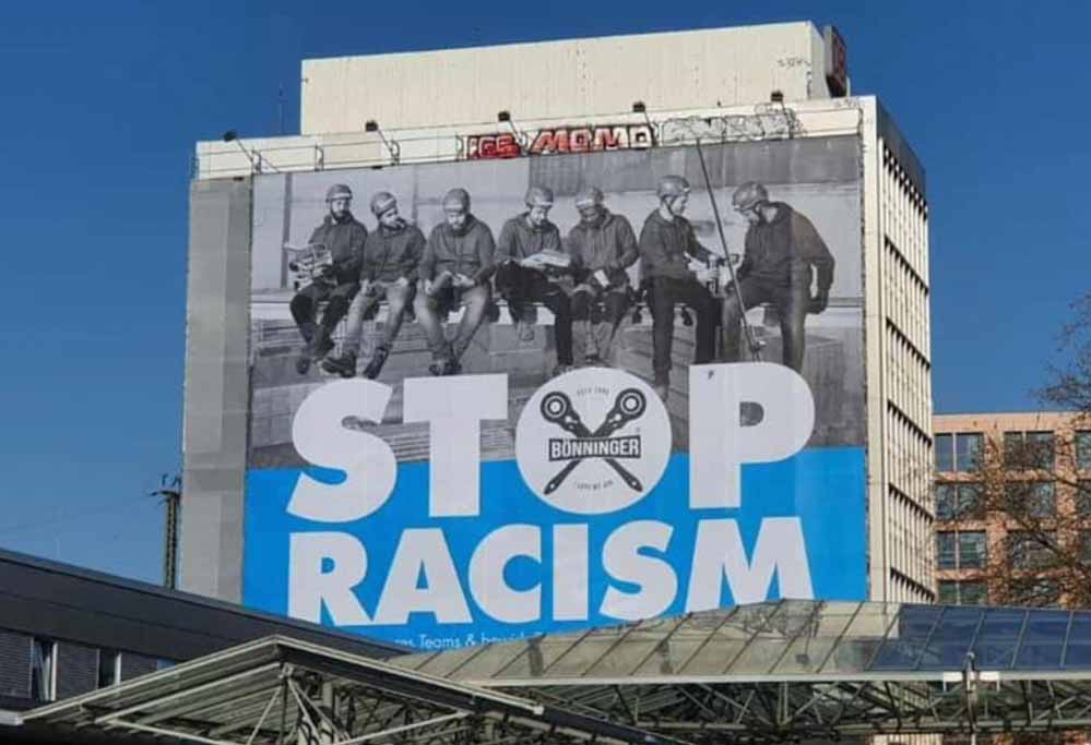Erneut setzt die Firma Bönninger Gerüstbau Dortmund am Hauptbahnhof mit Ihrem Plakat ein wichtiges Statement: STOP RACISM.