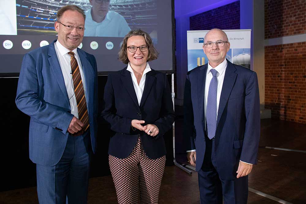 Bildzeile: Die Sitzung der IHK-Vollversammlung am 23. September 2021 im Bildungszentrum Hansemann der Handwerkskammer Dortmund (v. l.): IHK-Hauptgeschäftsführer Stefan Schreiber, NRW-Ministerin für Heimat, Kommunales, Bau und Gleichstellung Ina Scharrenbach und IHK-Präsident Heinz-Herbert Dustmann.