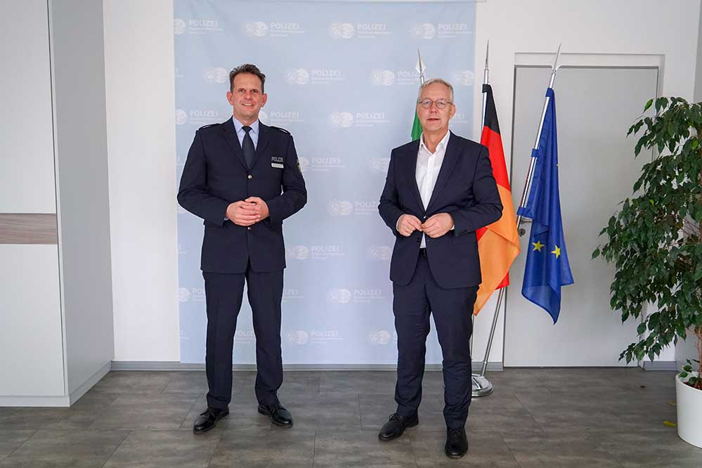 Bildzeile: Dortmunds Polizeipräsident Gregor Lange (r.) begrüßte den neuen Leiter der Gefahrenabwehr, Achim Stankowitz.