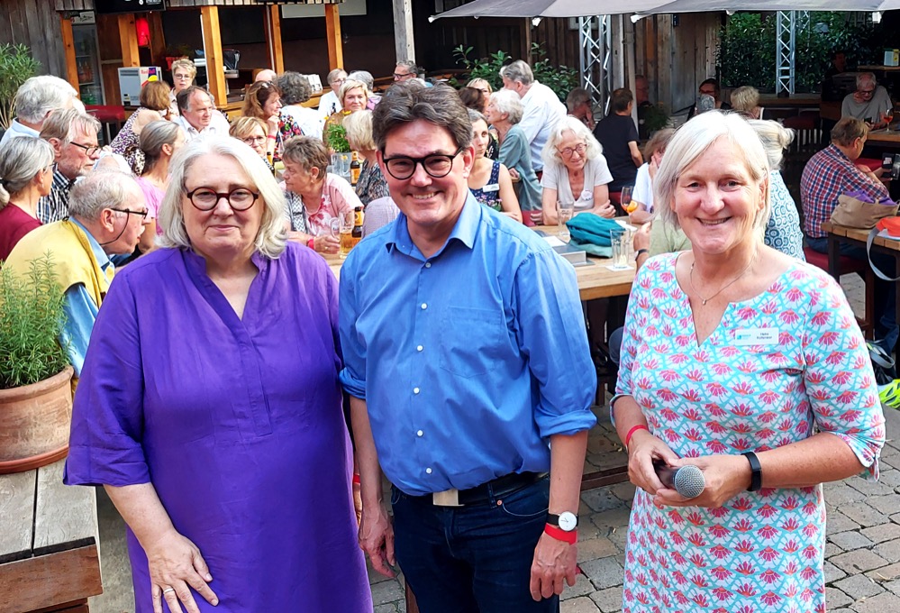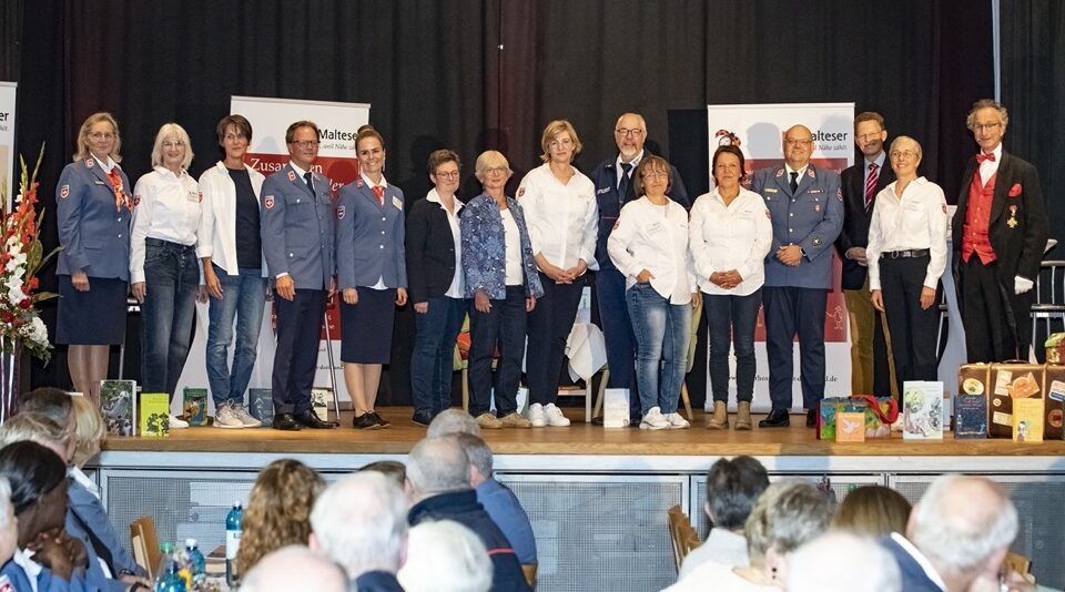 Anschließend kamen die Gottesdienstbesucher mit weiteren Gästen im Kulturzentrum Alte Schmiede zusammen. Rund 130 Personen – bestehend aus Mitarbeitenden, Ehrenamtlichen, Freunden, Förderer, Kooperations- und Netzwerkpartnern – wurden dort feierlich von Butler George (alias Christoph Gilsbach, Performancekünstler, Klinikclown und Moderator) in Empfang genommen. Als besondere Gäste begrüßte Christina Motschull, kommissarische Gesamtleitung der Malteser Hospizdienste, Bürgermeisterin Barbara Brunsing sowie die Malteser Diözesanoberin und stellvertretende Diözesanleiterin Johanna Gräfin von Brühl. Motschull und Brühl dankten in ihren Grußworten vor allem den 100 Ehrenamtlichen; ihre Motivation und ihr Engagement seien die Grundpfeiler der Hospiz- und Trauerarbeit. Seit dem Gründungsjahr wurden in rund 50 Qualifizierungskursen 600 Teilnehmende ausgebildet, die zahlreiche Menschen beim Sterben und in der Trauer begleitet haben.