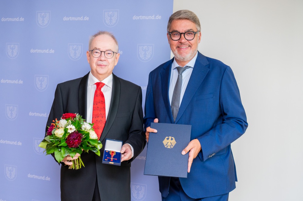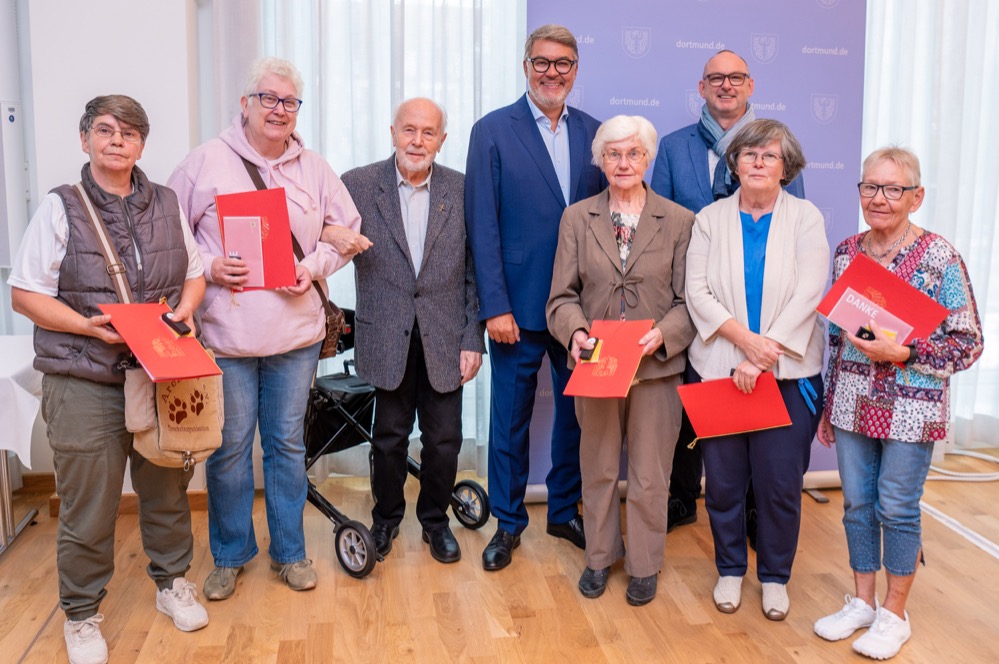Ihr freiwilliges Engagement leistet einen wichtigen Beitrag für die Gesellschaft: OB Thomas Westphal ehrte sechs Dortmunder Bürger*innen für ihren jahrelangen, unermüdlichen Einsatz im Tierschutz und in der Unterstützung von Obdachlosen mit der Ehrenamtsnadel. Fünf Tierschützerinnen sowie der ehemalige Pfarrer Reinhart Ellbracht erhielten die Ehrenamtsnadel der FreiwilligenAgentur Dortmund sowie die Jubiläumsehrenamtskarte NRW. Die Verleihung fand im Saal Westfalia des Rathauses statt. Reinhart Ellbracht wurde für sein Engagement beim Bruder-Jordan-Werk und dem Gast-Haus Dortmund geehrt. Der ehemaliger Pfarrer der Herz-Jesu-Gemeinde in Hörde, setzte sich nach seinem Ruhestand im Alter von 65 Jahren intensiv für Obdachlose und Bedürftige ein. 1995 initiierte er die Gründung des Gast-Hauses an der Rheinischen Straße, das bis heute eine wichtige Anlaufstelle für wohnungslose Menschen in Dortmund ist. Mit seinem Idealismus und Organisationstalent legte er den Grundstein für zahlreiche soziale Initiativen, die bis heute bestehen. Die fünf Tierschützerinnen wurden für ihre langjährige Arbeit in verschiedenen Organisationen ausgezeichnet: Regine Weber engagiert sich seit rund 15 Jahren bei der Arbeitsgruppe Igelschutz Dortmund e. V. Sie steht während der Igel-Saison mehrfach pro Woche im Tierschutzzentrum für Beratung und Nothilfe zur Verfügung. Darüber hinaus ist sie ganzjährig im Einsatz für kranke und bedürftige Tiere und beteiligt sich an zahlreichen Veranstaltungen rund um den Naturschutz. Jutta Quiring ist seit 1992 ehrenamtlich im Dortmunder Katzenschutzverein e. V. tätig und derzeit dessen stellvertretende Vorsitzende. Gemeinsam mit Renate Kolbe, Gründungsmitglied des Vereins, leistet sie seit Jahren wertvolle Unterstützung bei Kastrations- und Einfangaktionen von herrenlosen Katzen. Beide koordinieren die Unterbringung und Vermittlung von Tieren in Pflegefamilien und sind seit Jahrzehnten bei Informationsveranstaltungen für die Bevölkerung aktiv. Heike Beckmann und Gabriele Bayer, beide langjährig für die Tierschutzorganisation Arche 90 e. V. tätig, engagieren sich seit den frühen 1990er-Jahren für den Tierschutz in Dortmund. Sie etablierten einen Notrufservice, der täglich zahlreiche Hilferufe aus der Bevölkerung annimmt, um verletzte oder hilfsbedürftige Tiere zu versorgen. Die Geehrten erhielten neben der Ehrenamtsnadel und der Jubiläumsehrenamtskarte NRW auch ein Geldpräsent in Höhe von 250 Euro, das an die Organisationen weitergeleitet wird, in denen sie aktiv sind.