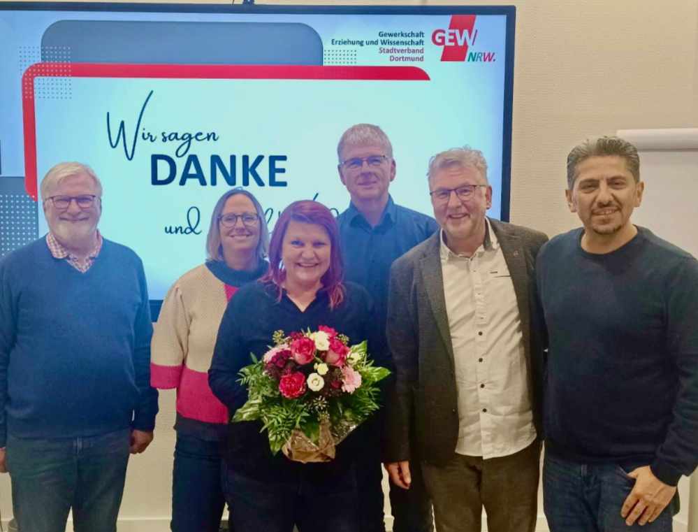 Neue erste Vorsitzende ist Birgitta Scholten (dritte von links). Der Vorstand verabschiedet sich dankend von Mehmet Polat (rechts). Martin Heuer (zweite von rechts), Peter Rieken (dritte von rechts) und Vera Verspohl (zweite von links) wurden als stellvertretende Vorsitzende gewählt. Ulrich Roseneck (links) wird drei weitere Jahre die Kasse der Bildungsgewerkschaft führen.