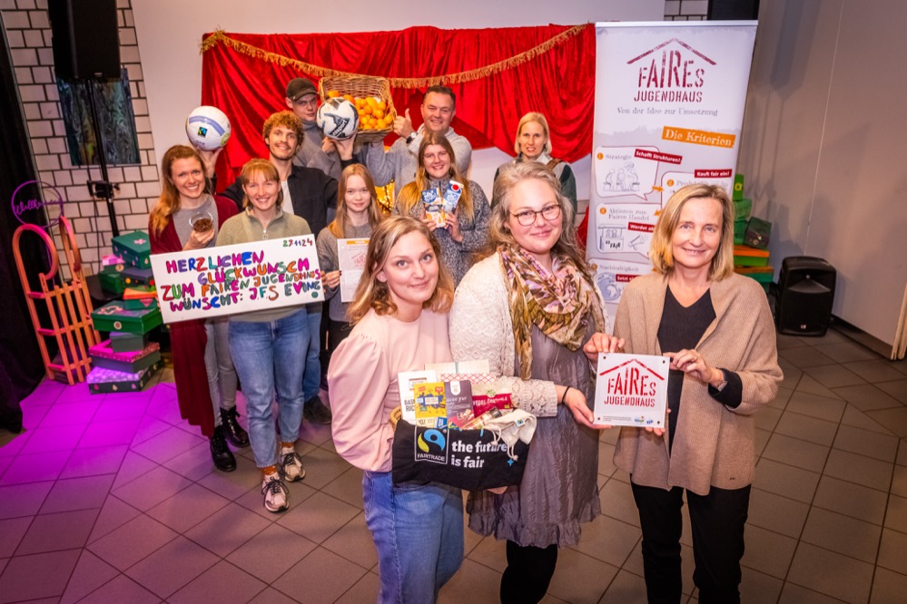 Die Jugendfreizeitstätte Hombruch darf sich mit dem Titel „Faires Jugendhaus“ schmücken. Mitarbeitende und Jugendliche hatten sich mit zahlreichen Projekten für Nachhaltigkeit, Globales Lernen und Fairen Handel eingesetzt. Melanie Michels, Leiterin der JFS Hombruch, nahm die Auszeichnung aus den Händen von Monika Nienaber-Willaredt, Dezernentin für Schule, Jugend und Familie der Stadt Dortmund, entgegen. Die Dezernentin lobte den Einsatz aller Akteur*innen für die gute Sache: „Nur gemeinsam mit Kindern und Jugendlichen lässt sich die Welt nachhaltig verändern. Die Jugendfreizeitstätte Hombruch lebt Partizipation vor. Junge Menschen bekommen hier die Möglichkeit, Verantwortung zu übernehmen.“ Das Projekt „Faires Jugendhaus“ ist Teil der „Charta Faire Metropole Ruhr 2030“, die im Dezember 2022 vom Rat der Stadt beschlossen wurde. Diese Charta fördert menschenwürdige Arbeitsbedingungen und Nachhaltigkeit und stellt die 17 Nachhaltigkeitsziele der Vereinten Nationen in den Mittelpunkt. Die Jugendfreizeitstätte Hombruch hat mit einer Vielzahl an Aktivitäten und Aktionen vorbildlich gezeigt, wie sich Fairer Handel und Nachhaltigkeit praktisch in den Strukturen und Bildungsangeboten der Einrichtung verankert lassen. Dazu hat ein Team aus Jugendlichen, Mitarbeitenden, Ehrenamtlichen und Besucher*innen immer wieder tolle Aktionen zu den Themen Fairer Handel und Globale Gerechtigkeit auf die Beine gestellt. Im Frühjahr 2024 gab es beispielsweise den Fairen Fußball-Cup. Gespielt wurde nicht nur mit fair gehandelten Bällen – während des Turniers wurden Spieler*innen und Besucher*innen über die schlechten Produktionsbedingungen in Fußball-Fabriken informiert und Fairtrade-Bälle als eine gerechte Alternative vorgestellt. Auch das ist wichtig: Fairer Handel muss sichtbar gemacht werden. Genascht wird in der Jugendfreizeitstätte Hombruch natürlich auch fair: beispielsweise am fairen Schokoladen-Brunnen oder fair gehandelte Produkte wie Bananen oder Orangensaft. Außerdem engagiert sich die Einrichtung aktiv gegen Lebensmittelverschwendung, indem sie unter anderem mit einem lokalen Supermarkt und dem „Fairteiler“ kooperiert. Im Bereich Bekleidung setzt das Jugendhaus ebenfalls auf Nachhaltigkeit: Die „Gift-Box“, eine selbstgebaute Kleidertauschbörse, verschafft gebrauchten Kleidungsstücken ein zweites Leben. Für drei Jahre darf sich die Jugendfreizeitstätte Hombruch jetzt „Faires Jugendhaus“ nennen. Dann wird erneut überprüft, ob die Einrichtung die Kriterien der Auszeichnung weiter umgesetzt hat. Auch das ist ziemlich fair. Die Kampagne „Faires Jugendhaus“ ist Teil des Projekts „Gemeinsam fair handeln – Faire Metropole Ruhr“ und wird in Kooperation mit der Servicestelle Kommunen in der Einen Welt (SKEW) von Engagement Global mit Mitteln des Bundesministeriums für wirtschaftliche Zusammenarbeit und Entwicklung (BMZ) sowie der Stiftung Umwelt und Entwicklung Nordrhein-Westfalen durchgeführt.