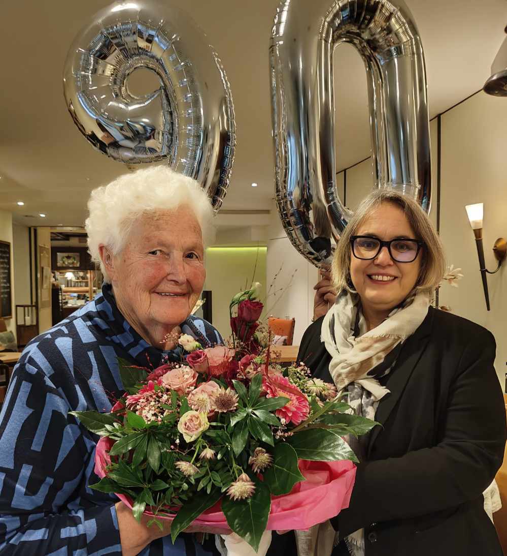 Helga de West freute sich zu ihrem 90. Geburtstag nicht nur über die Glückwünsche ihrer AWO-Freundinnen: Die Vorsitzende des UB Dortmund und SPD-Landtagsabgeordnete, Anja Butschkau, überraschte die ehemalige und langjährige Vorsitzende des AWO-Ortsvereins Sölde mit einem großen Blumenstrauß und gratulierte persönlich zum Ehrentag.