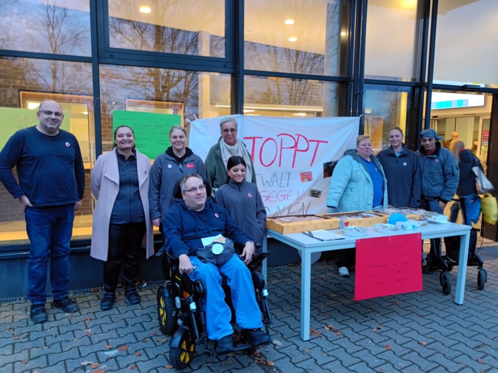 Mit verschiedenen Aktionen trat die Arbeiterwohlfahrt entschieden Statements zum Tag gegen Gewalt an Frauen in die Öffentlichkeit. In den Werkstätten der AWO im Dortmunder Norden hatten am Morgen bereits mehrere Beschäftige ein Zeichen gesetzt: Die Frauenbeauftragten, Betriebsrätinnen und ihre Kollegen aus Werkstattrat und Wäscherei erwarteten die ca. 700 Beschäftigten der WAD mit Waffeln und verteilten Ansteck-Buttons zum Thema Gewalt gegen Frauen. Die Mitarbeitenden belohnten die Aktion mit viel Aufmerksamkeit und Beifall.