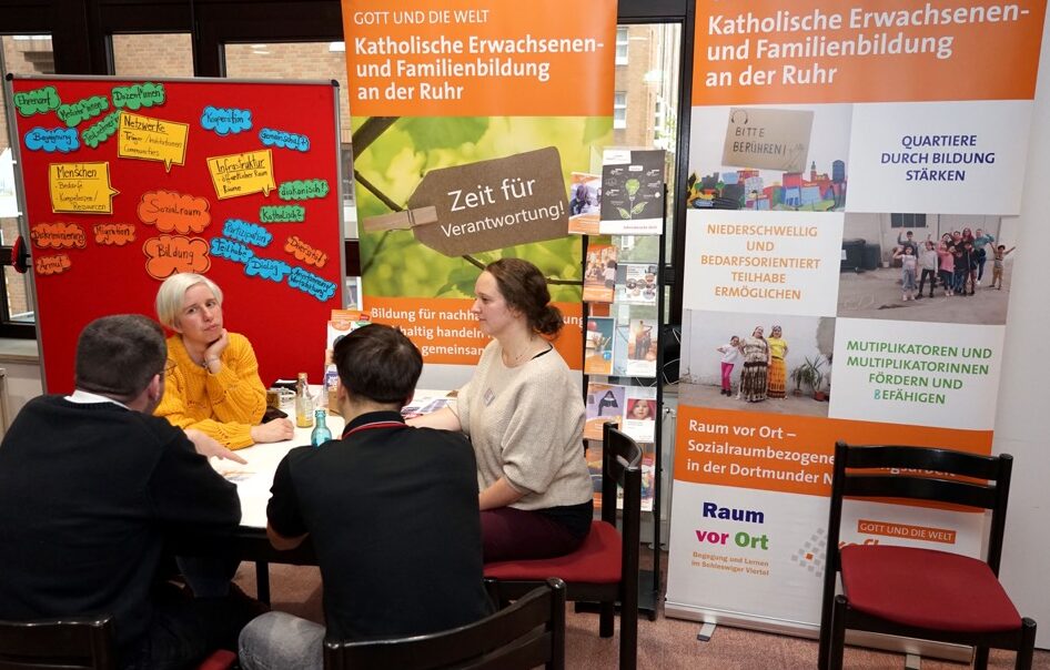Bei seinem Besuch in Dortmund hatte Erzbischof Dr. Udo Markus Bentz die Idee eines kirchlichen Netzwerkes in der Stadt „mit starken Knotenpunkten“ beschrieben. Es brauche dazu eine „Idee für das Ganze“ und die Bereitschaft, Grenzen und Konkurrenz untereinander zu überwinden. Diesen Gedanken griff die Dekanatspastoralkonferenz der hauptamtlichen Seelsorgerinnen und Seelsorger der Katholischen Stadtkirche Dortmund auf. Bei ihrem Treffen im Katholischen Centrum präsentierten sich unterschiedliche Dienste und Einrichtungen der sogenannten Kategoriealseelsorge in einem „Markt der Möglichkeiten“. Deren Mitarbeiterinnen und Mitarbeiter konnten so untereinander und mit den hauptamtlichen Seelsorgerinnen und Seelsorgern aus den Kirchengemeinden ins Gespräch kommen, das bestehende Netzwerk verbessern und erweitern. Beteiligt waren die Ökumenische Notfallseelsorge, die Klinikseelsorge, IN VIA Kath. Mädchensozialarbeit Dortmund e.V., die Telefonseelsorge, die Katholische Erwachsenen- und Familienbildung (kefb), die Gemeinden anderer Muttersprache, die Katholische Beratungsstelle für Ehe-, Familien- und Lebensfragen (EFL), die BVB-Gründerkirche, die Katholische St. Paulus Gesellschaft, der Sozialdienst katholischer Frauen SkF Hörde e.V., die Katholische Hochschulgemeinde Dortmund (KHG) und das Katholische Forum. Sie kamen darüber in den Austausch, wie sie zusammen mit den Kirchengemeinden und Pastoralen Räumen noch mehr zu einem „Netzwerk Kirche“ in Dortmund zusammenwachsen können.