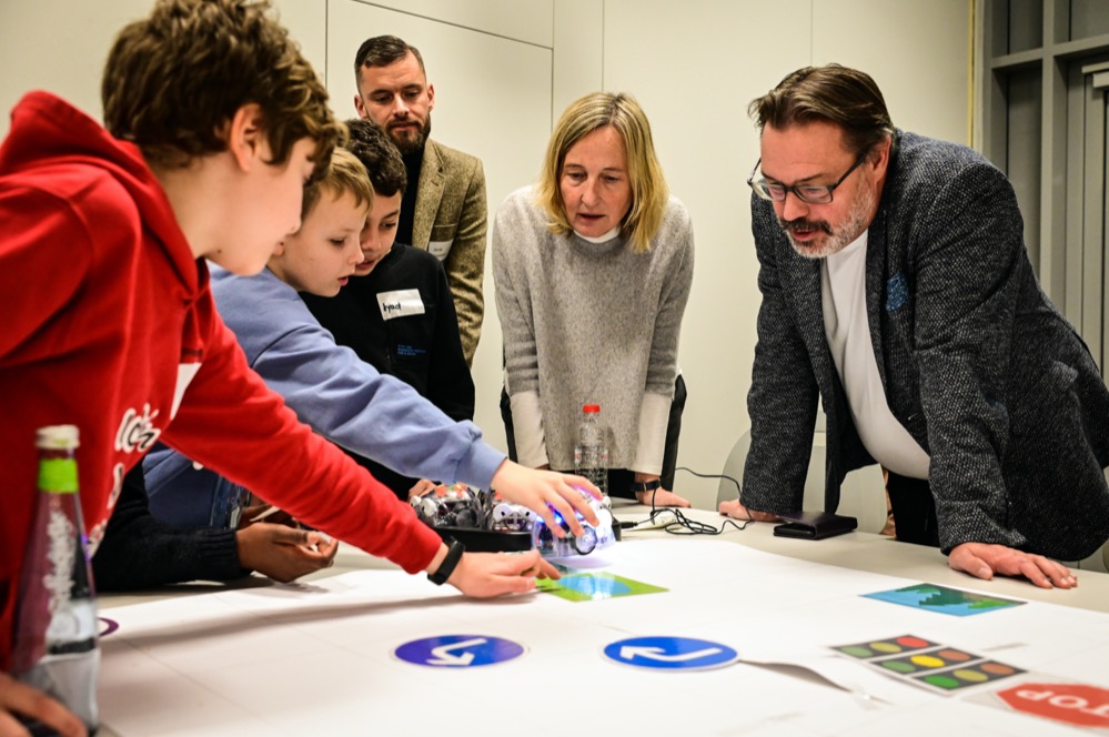 Auf dem Bild zeigen Grundschüler, Jacob Chammon (3.v.r.), Geschäftsführer der Deutschen Telekom-Stiftung, Monika Nienaber-Willaredt, Dezernentin für Schule Jugend und Familie und Bezirksbürgermeister Werner Gollnick (r.) kleine fahrende Roboter.