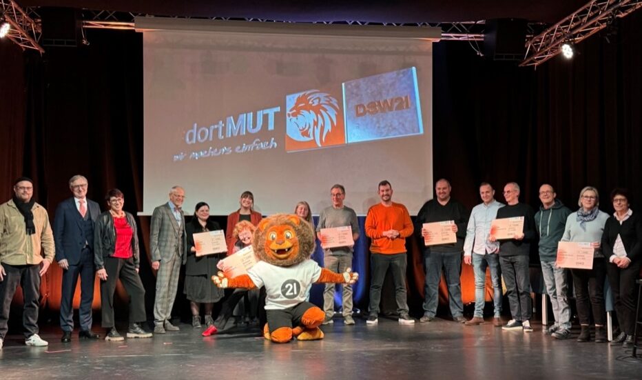 Im Rahmen einer Feierstunde in der Eventhalle der »Stiftung Kinderglück« hat die Dortmunder Stadtwerke AG – DSW21 die Spendenschecks an die diesjährigen Preisträger des Förderwettbewerbs #dortMUT übergeben. Die Spendensumme in einer Gesamthöhe von 84.000 Euro wurde unter 31 Vereinen aufgeteilt. Die meisten erhielten die maximale Förderung in Höhe von 3.000 Euro für ein einzelnes Projekt. Vielleicht liegt’s am Namen der Location. Vielleicht auch daran, dass Schenken und Geschenke zu erhalten einfach Spaß macht. Jedenfalls war die Preisverleihung in der Kinderglück-Halle auch 2024 wieder eine echte Gute-Laune-Veranstaltung. DSW21-Vorstandssprecher Jörg Jacoby und Verkehrsvorstand Ulrich Jaeger scherzten: „So gerne wie heute geben wir selten 84.000 Euro aus.“ Im Mittelpunkt der Veranstaltung standen die Vereine und gemeinnützigen Organisationen, deren Projektskizzen die prominent besetzten Jurys in den vier Kategorien »Soziales«, »Kultur«, »Sport« sowie »Diversity & Nachhaltigkeit« überzeugt hatten. Je 21.000 € vergab DSW21 in pro Kategorie. Insgesamt hat die Konzernmutter der kommunalen 21-Gruppe damit seit der Gründung des Wettbewerbs im Jahr 2020 bereits 420.000 € für Projekte ausgeschüttet, die unsere Stadt (noch) besser machen. Mit der Summe stärkt DSW21 zugleich das unverzichtbare ehrenamtliche Engagement.