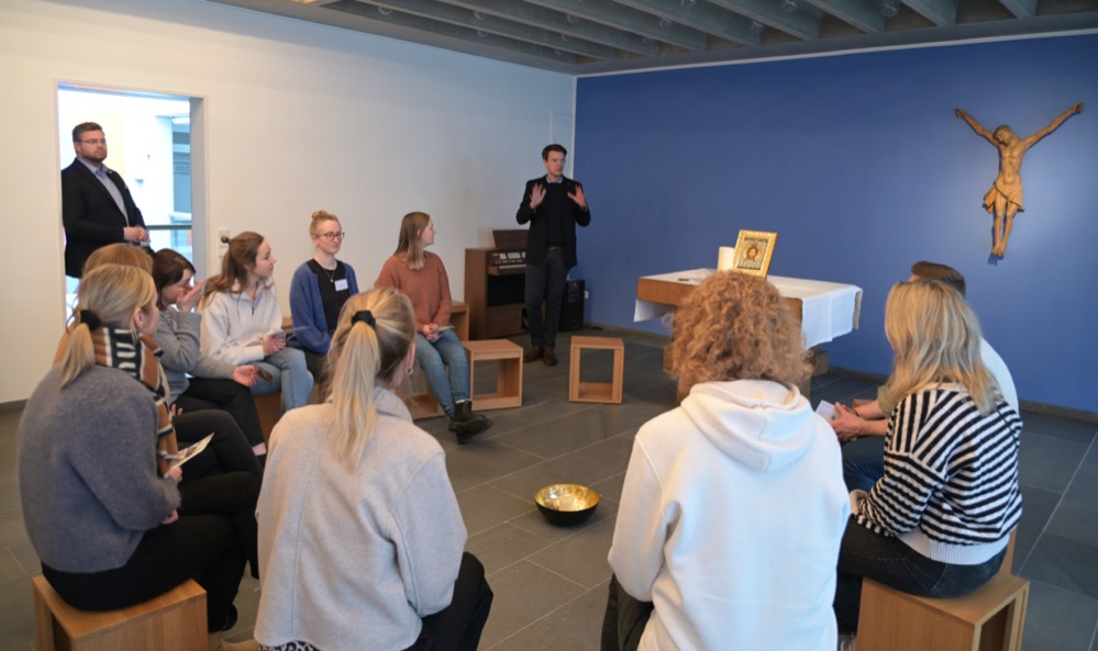 Dazu gehörte am ersten der beiden Tage ein persönliches Kennenlernen der Mitarbeitenden aus dem Bereich Schule und Hochschule im Konrad-Martin-Haus in Paderborn. Referentin Sarah Münsterteicher gab den Lehrerinnen und Lehrern beispielsweise einen Überblick über die Angebote der Schulpastoral, die sich an Lehrende, Lernende und auch Eltern richten und „stark machen“ sollen, so Münsterteicher. Außerdem machten die Lehrkräfte auch Station in der Kapelle des Konrad-Martin-Hauses.