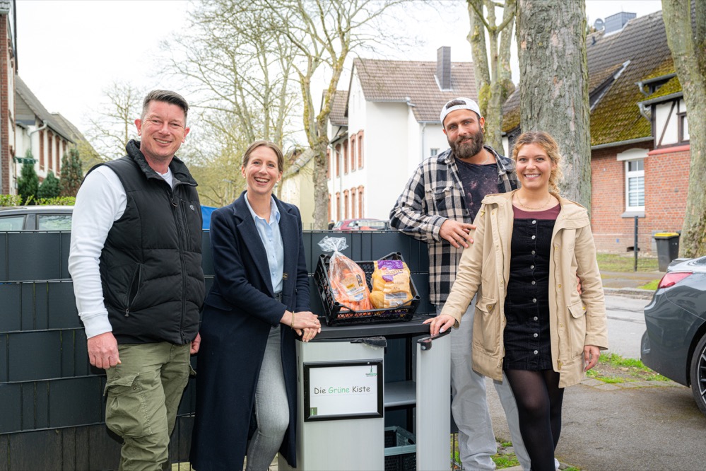 Nicht nur Anwohnerinnen und Anwohner der Husarenstraße kennen „Die Grüne Kiste“ – in ganz Eving hat sich der Foodsharing-Schrank bereits einen Namen gemacht. Vor einem Jahr initiierten Lena Gließner und ihr Partner Kevin Collins den sogenannten „Fairteiler“ – ein Angebot für kostenlose Lebensmittel. Das Paar setzt sich damit gegen Lebensmittelverschwendung ein und ist auch im Verein foodsharing Dortmund e.V. aktiv. Unterstützt werden sie dabei vom Wohnungsunternehmen Vonovia. Das Dortmunder Team hat den dafür benötigten Platz im Quartier zur Verfügung gestellt. Zudem hat es den dortigen Untergrund samt Gehweg gepflastert, um einen barrierearmen, sicheren Zugang für die gesamte Nachbarschaft zu ermöglichen. Seit dem vergangenen Jahr ist der Foodsharing-Schrank in Eving Teil des Verteilsystems, das die Mitglieder des Vereins foodsharing Dortmund e.V. auf die Beine gestellt haben. Sie holen die Lebensmittel von Bäckereien oder Supermärkten der Umgebung ab. Bei diesen Lebensmitteln ist beispielsweise das Mindesthaltbarkeitsdatum abgelaufen oder die Verpackung zerdrückt, auch Äpfel mit einzelnen braunen Stellen sind dabei. So werden diese Lebensmittel davor bewahrt, dass die Märkte sie ansonsten wegschmeißen würden. Nach einer gründlichen Sortierung der Lebensmittel werden diese in die Foodsharing-Schränke und auf die Ausgabestellen des Vereins verteilt. Hierzu zählt auch „Die Grüne Kiste“ von Lena Gließner in der Husarenstraße. Das Konzept der Lebensmittelrettung begeisterte die 27-Jährige schon länger. Vor etwa einem Jahr beabsichtigte sie, selbst einen „Fairteiler“ aufzustellen und trat mit der Idee an ihren Vermieter Vonovia heran. Mit Erfolg: Der Schrank inklusive Gehweg wurde schnell realisiert. Seither wird das Angebot von der Nachbarschaft gut angenommen. „Durch die Verteilung leisten wir nicht nur einen wertvollen Beitrag gegen Lebensmittelverschwendung, sondern bauen auch neue Verbindungen in der Nachbarschaft auf“, erzählt Lena Gließner. „Hier im Quartier ist ein enger Austausch entstanden – auch kulinarisch. So haben wir beispielsweise manchmal viele Tomaten für die Box, die dann von Anwohnern zu köstlicher Tomatensoße verarbeitet werden, die wiederum in der Nachbarschaft für Pizza und Pasta verteilt und verköstigt wird. Ein Gewinn für uns alle.“ Zum einjährigen Jubiläum besuchte Vonovia Bewirtschafter Patrick Kilp gemeinsam mit Regionalleiterin Maike Holtrop das engagierte Mieterpaar. Bereits beim Aufbau des Foodsharing-Schrankes war Kilp mit vor Ort: „Als Frau Gließner und Herr Collins mit ihrer Idee auf uns zukamen, waren wir sofort begeistert. Bei einem Besuch stellte sich heraus, dass eine Umsetzung direkt an der Husarenstraße gut möglich ist. Auch nach nunmehr einem Jahr ist die Resonanz groß, die Nachbarschaft kommt hier in den Austausch und wächst enger zusammen. Wir sind froh, damit das wertvolle Engagement vor Ort unterstützen zu können.“