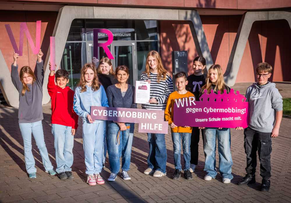 Die Reinoldi-Gesamtschule Dortmund engagiert sich aktiv gegen digitale Gewalt und ist ab sofort offizielle Projektschule des Programms „WIR gegen Cybermobbing! Unsere Schule macht mit.“ des Cybermobbing-Hilfe e.V. Mit der Teilnahme unterstreicht die Schule ihr klares Bekenntnis zu einem respektvollen und gewaltfreien Umgang im digitalen Raum. Durch die Unterstützung der Stiftung – Dein Zuhause hilft, einer Initiative der LEG-Immobilien-Gruppe, konnte die Schule an dem Programm teilnehmen. An insgesamt sechs Projekttagen nahmen alle Schülerinnen und Schüler der Jahrgänge 5, 6 und 7 an interaktiven Workshops teil. Diese boten ihnen nicht nur Einblicke in die Gefahren von Cybermobbing, sondern auch konkrete Handlungsmöglichkeiten, um sich selbst und andere zu schützen. Neben theoretischen Inhalten standen kreative Medienprojekte auf dem Programm, die das neu erworbene Wissen direkt anwendbar machten. Ein zentrales Element des Programms ist die Selbstverpflichtungserklärung, die von den teilnehmenden Schülerinnen und Schülern sowie den Lehrkräften unterzeichnet wurde. Damit verpflichten sie sich, aktiv gegen Cybermobbing einzutreten und eine positive digitale Kommunikationskultur zu fördern.
