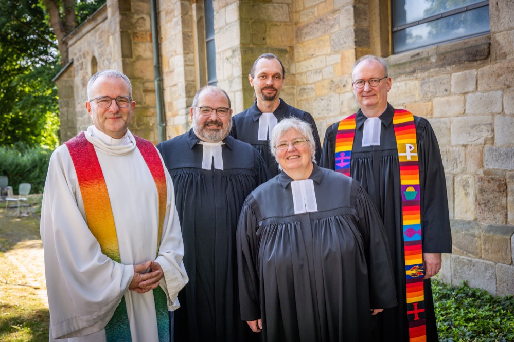 Das Bild zeigt Pfarrerin Bettina Wirsching mit Pfarrer Guido Hoernchen, die Pfarrer Jens Nieper und David Raasch aus der Ev. Christus-Kirchengemeinde sowie der Ständig Stellvertretende Superintendent Michael Stache.